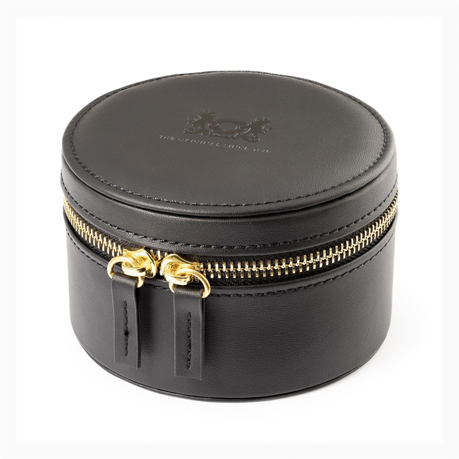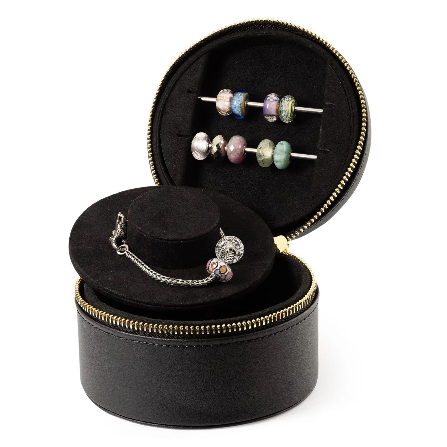 Diese elegante, runde Schmuckschatulle wurde entworfen, um deine kostbaren Trollbeads stilvoll aufzubewahren und zu organisieren. Sie ist mit hochwertigem Kunstleder in einem edlen Schwarz bezogen und mit einem stilvollen goldenen Reissverschluss versehen.